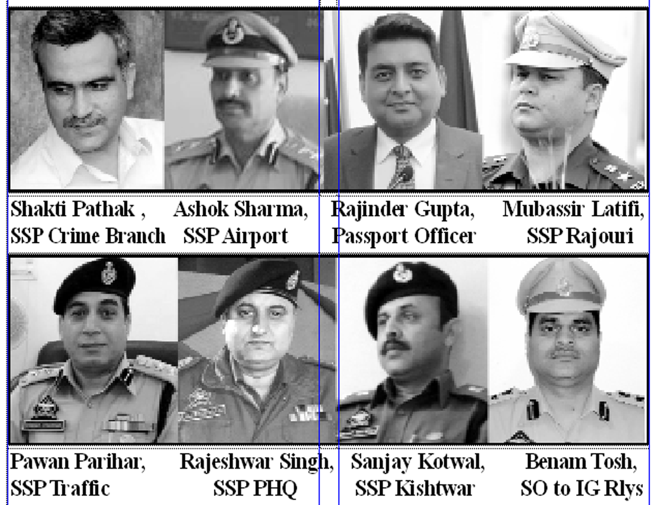 The promoted officers included SP Airport Ashok Sharma, SP Crime Branch, Jammu Shakti Pathak, SP Rajouri Mubassir Latifi, SP Samba Anil Magotra, SP Kathua Mohan Lal, SP Traffic Jammu Pawan Parihar, SSP Police Headquarters Rajeshwar Singh, SP Rajinder Gupta (who is on Central deputation as Passport Officer), SO to IGP Railways, Benam Tosh, SSP Kishtwar Sanjay Kotwal, SP Police Control Room (PCR) Jammu JS Johar, Ghulam Rasool Dar, Rajnish Pran, Bashir Ahmad Nazar, Mohammad Yusuf Shah, ML Mehra, Mohammad Sayeed Punnu, Bashir Ahmad Maqdoomi, Aftaab Ahmad Kakroo, Haseeb Mughal, Javed Ahmad Koul, Vikas Gupta, Dr Ajit Singh, Suhail Munawar Mir, Rashmi Wazir, Randeep Wazir, Anita Sharma, Zahid Manhas, Joginder Singh, Tej Ram Katoch, Manzoor Ahmed Dallal, Altaf Hussain Khan, Ranjit Singh Samyal, Sanjeev Khajuria, Rajesh Bali, Romesh Angral, Shailender Kumar, Kulbir Singh Choudhary, Mohammad Arif Reshu and all SPs of 1999 batch.
