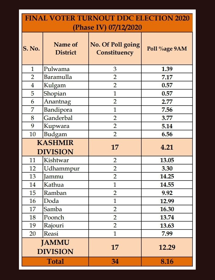 JAMMU: The 4th phase of DDC elections 2020 recorded voter percentage of 8.16 % across different constituencies spread over different districts of Jammu and Kashmir till 09:00 am today.
