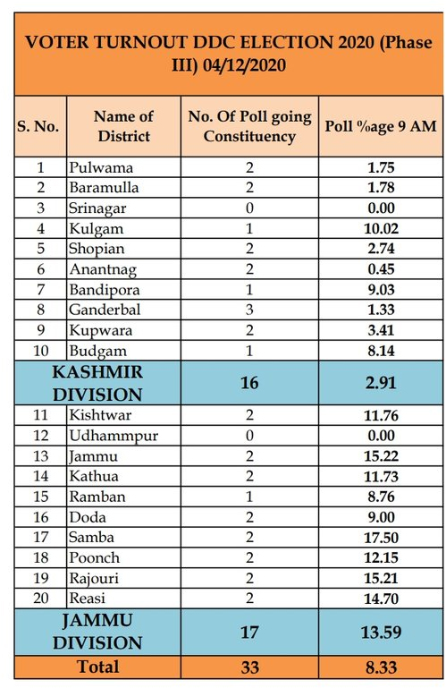 JAMMU: The 3rd phase of DDC elections 2020 recorded voter percentage of 8.33 % across different constituencies spread over different districts of Jammu and Kashmir till 09:00 am today.