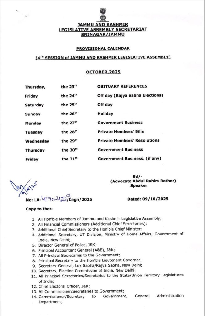 According to the provisional calendar released by the Speaker Abdul Rahim Rather, the session will commence on October 23 with obituary references, while business proceedings will be held on six working days.