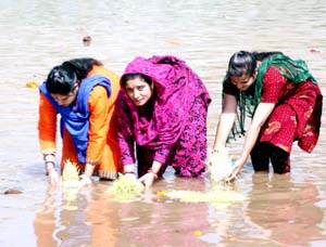 Heavy rush of devotees was seen at the Bikram Chowk on Tawi Bank,  Harkipori near Bagh-e-Bahu,  Rajinder Park canal, Shakti Nagar, Paloura, Muthi, Barnai, Patoli as well as on the bank of river Chander Bagha (Chenab) in Akhnoor where people were seen busy from early in the morning in  immersion of Saakh.