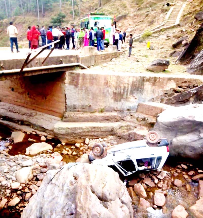 The accident took place when driver of the car could not negotiate a curve between a bridge and approach road. The car fell into the nallah and was completely damaged in the mishap.