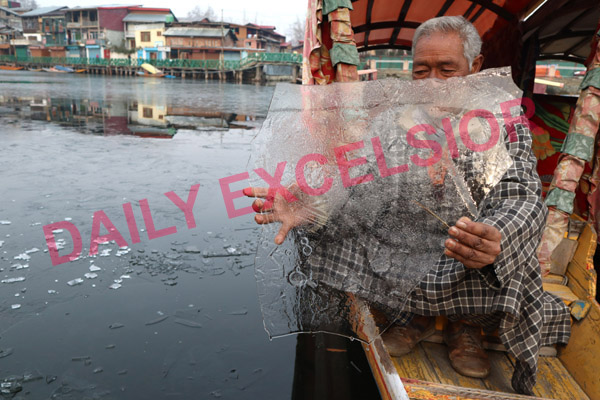 A boat man showing frozen Dal lake by lifting solid upper water layer in hand at Srinagar. —Excelsior/Shakeel