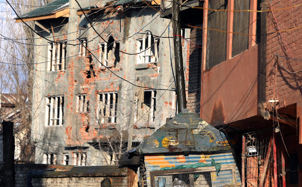 A building where two militants were killed at Karan Nagar, Srinagar on Tuesday. Another pic on page 9. -Excelsior/Shakeel