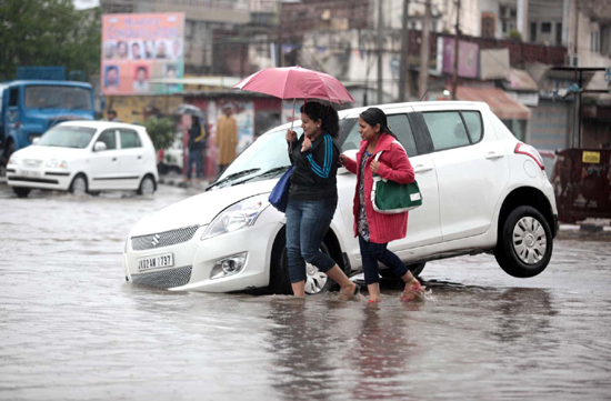A car got struck into a pit during heavy rain at Bikram Chowk in Jammu.    —Excelsior/Rakesh