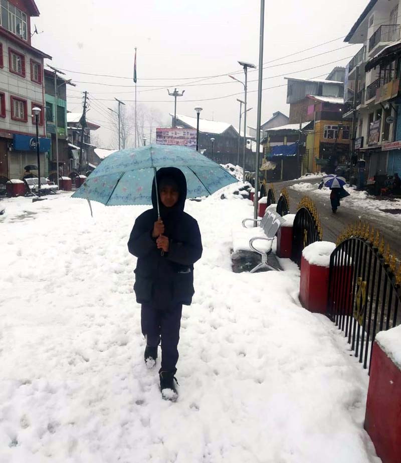 A child moving through snow clad road at Bhaderwah town on Sunday. -Excelsior/Tilak Raj