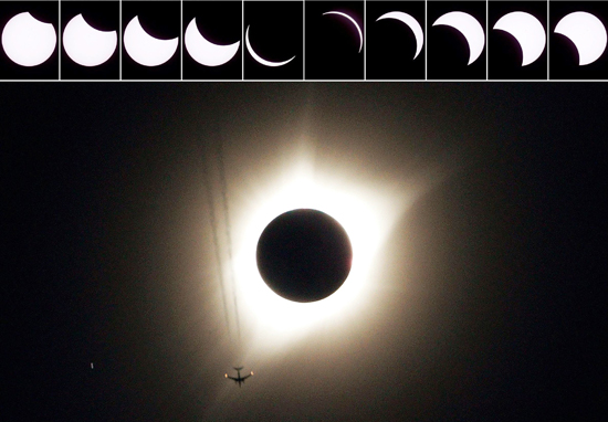 A combination of ten pictures shows the progression of a partial solar eclipse as a jet plane flies by the total solar eclipse in Guernsey, Wyoming in United States.