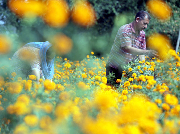 A couple plucks Marigold flowers from a field in Jammu on Thursday.  -Excelsior/Rakesh