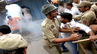 A CRPF jawan stops BJYM worker from marching towards the CC activists at Kachi Chawni.