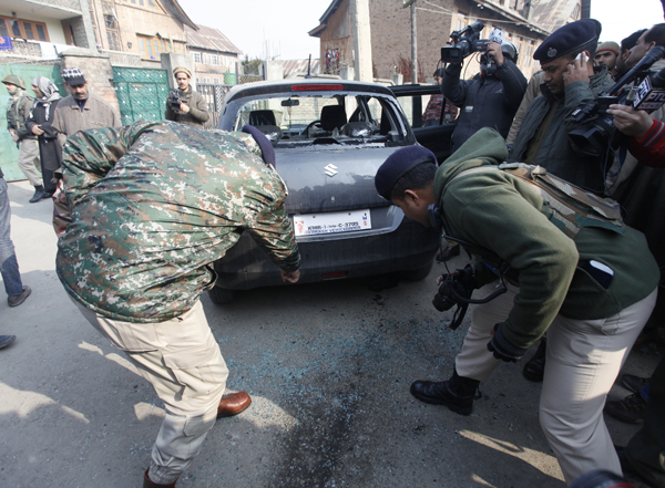 A CRPF officer inspecting damaged vehicle after a grenade attack in downtown Srinagar on Thursday. — Excelsior/Amin War By Daily Excelsior - December 18, 2015 Share FacebookTwitterWhatsAppPinterestLinkedinCopy URLTelegramEmailTumblrReddItPrintKoo A CRPF officer inspecting damaged vehicle after a grenade attack in downtown Srinagar on Thursday. — Excelsior/Amin War A CRPF officer inspecting damaged vehicle after a grenade attack in downtown Srinagar on Thursday. — Excelsior/Amin War Follow our WhatsApp channel