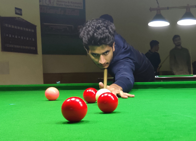 A cueist in action during a match of Junior Snooker Tournament at Billiards Hall, MA Stadium in Jammu. —Excelsior/Rakesh
