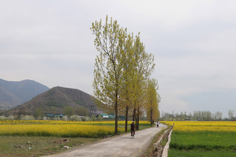 A cyclist rides along a road surrounded by vibrant fields of blooming mustard in Lethpora area of South Kashmir’s Pulwama district. -Excelsior/Younis Khaliq