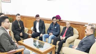 A delegation of journalists from Tripura calling on Union Minister Dr Jitendra Singh, in the wake of the recent killing of two journalists in the State, at New Delhi on Monday.