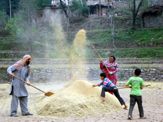 A family cleanse paddy crop in Mendhar on Wednesday.
