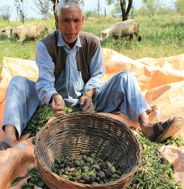 A farmer dries almonds at Koil in Pulwama on Sunday. — Excelsior/Younis Khaliq