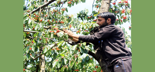 A farmer plucks cherries in Shopian on Wednesday. -Excelsior/Younis Khaliq