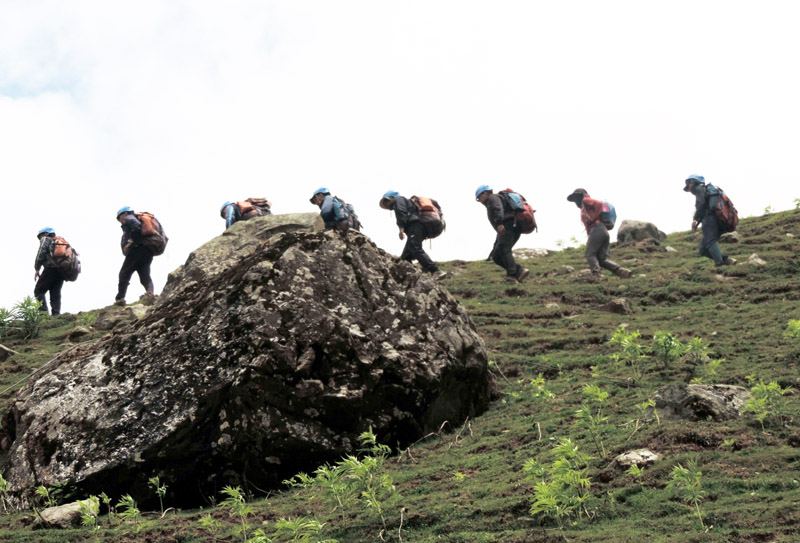A group of trekkers walking over a hill in the picturesque Sonamarg on Monday. (UNI)