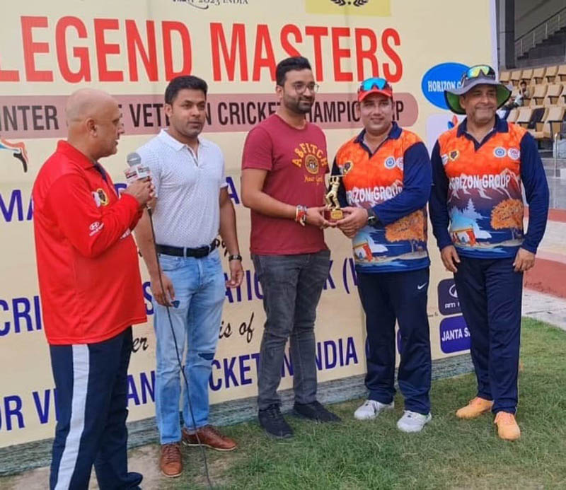 A guest presenting Man of the Match trophy to a player at MA Stadium, Jammu.