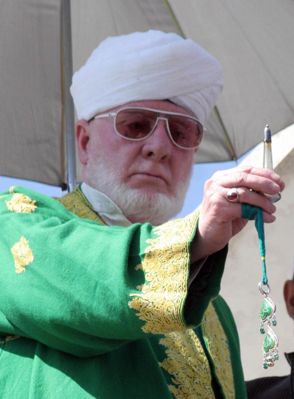 A head priest displaying a crystal jar containing the holy relic of Prophet Muhammad (SAW) before devotees at the Hazratbal shrine in Srinagar on the occasion of Meraj-e-Aalam on Friday. (UNI)