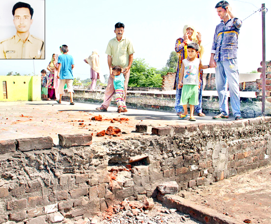 A house badly damaged in Pakistan shelling in Arnia sector. (Inset) Martyr BSF jawan Brijendra Bahadur Singh.
