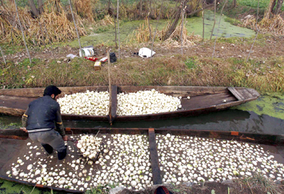 A Kashmiri man washes radishes in a boat on a cold winter day in Srinagar on Thursday. (UNI)