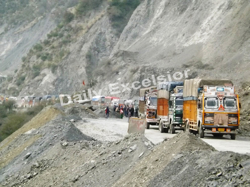 A long queue of stranded trucks on Jammu-Srinagar National Highway near Chanderkot in Ramban on Tuesday.— Excelsior/Parvaiz Mir