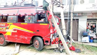 A mini-bus hits and damages a power transformer in Anand Nagar (Bohri), Jammu. By Daily Excelsior - June 15, 2018 Share FacebookTwitterWhatsAppPinterestLinkedinCopy URLTelegramEmailTumblrReddItPrintKoo A mini-bus hits and damages a power transformer in Anand Nagar (Bohri), Jammu. Follow our WhatsApp channel
