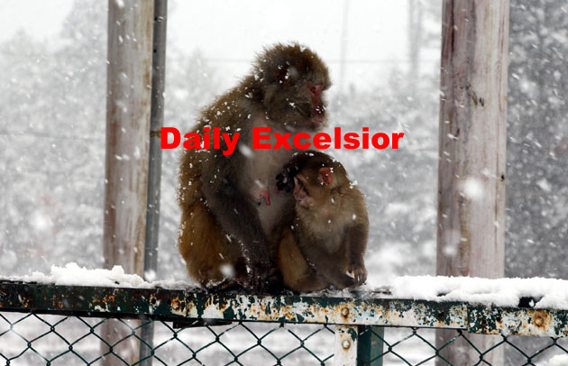 A monkey-mother protects her baby in lap from cold as snow falls in Gulmarg resort of Kashmir…Excelsior\Photo By Daily Excelsior - January 3, 2017 Share FacebookTwitterWhatsAppPinterestLinkedinCopy URLTelegramEmailTumblrReddItPrintKoo Follow our WhatsApp channel