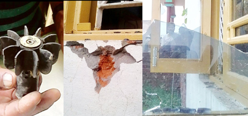 A mortar shell fired by the Rangers and houses damaged in shelling and firing at Jabowal in Arnia sector on Monday. -Excelsior/ Rakesh