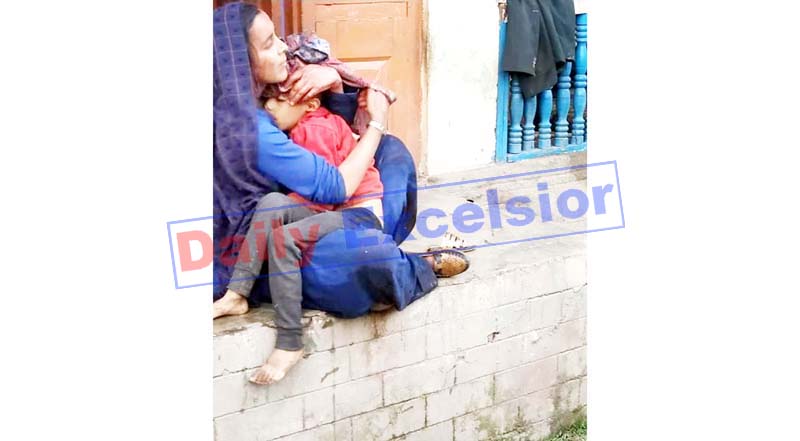 A mother holds her kid as they take shelter behind wall of their house during Pakistan shelling in Chowkibal on Sunday. -Excelsior/Aabid Nabi