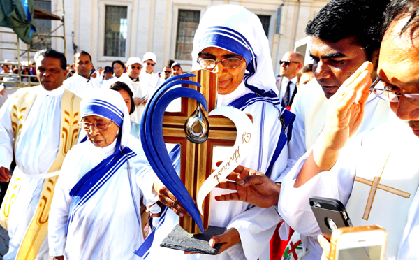 A nun, belonging to the global Missionaries of Charity, carries a relic of Mother Teresa of Calcutta before a mass celebrated by Pope Francis for her canonisation in Saint Peter’s Square at the Vatican on Sunday.