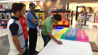 A person writing his message on largest notebook created by Vickrant Mahajan at Wave Mall, Jammu.