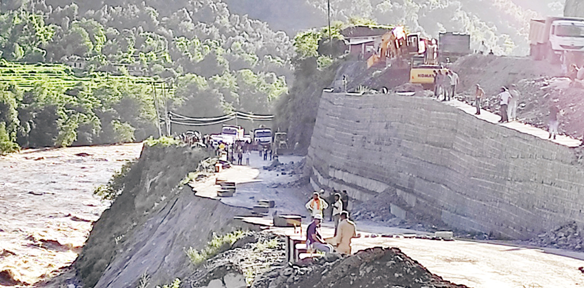A portion of Jammu-Srinagar National Highway along river Chenab at Chamba-Seri in Ramban washes away on Sunday. —Excelsior/Parvaiz Mir