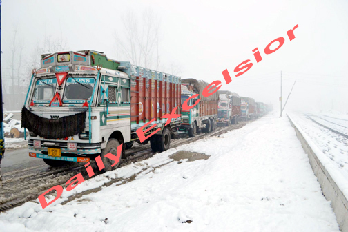 A queue of stranded trucks at Qazigund, 69 km from Srinagar, on the 300-Km long Srinagar- Jammu National Highway, which was closed for vehicular traffic today due to heavy snowfall near Jawahar tunnel and landslides in Panthial. Excelsior/ Sajad Dar