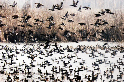 A record number of 4.5 lakh various kind of species of migratory birds have arrived in Kashmir from across the world to rest at the famed wetland Hokersar in Srinagar on Saturday. (UNI)
