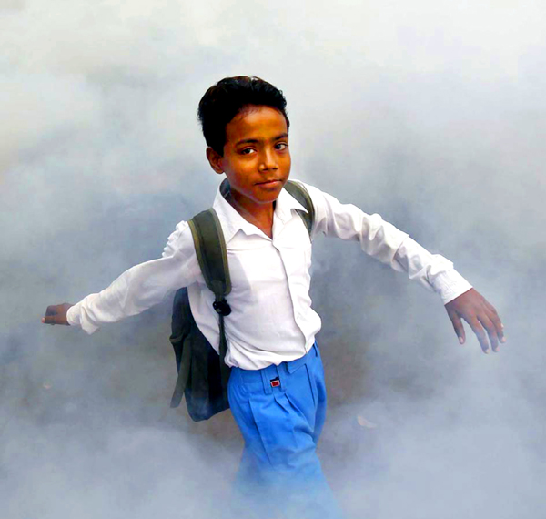 A school boy walks amid fumes emitted from fumigation work carried out by a municipal worker in a residential locality in New Delhi on Tuesday. (UNI)