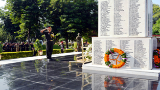 A senior Army officer paying tributes to martyrs at ‘Samriti Sathal’, Chandimandir to mark Raising Day of Western  Command.