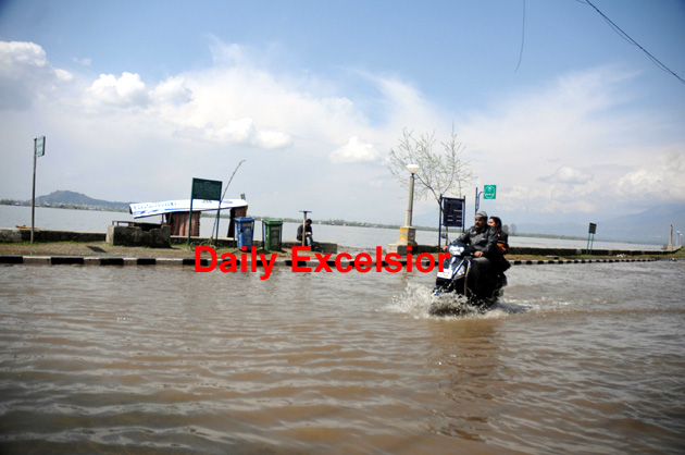 A tourist couple moves on a Scooter through flood water at Cheshmashahi road on the banks of World Famous Dal Lake , in Srinagar on Saturday .water levels rise on world famous Dal Lake Srinagar, Many low lying areas in Indian Kashmir were flooded for the second time since September last year. ..Excelsior/Mohd Amin War