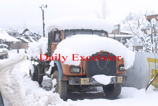 A vehicle covered with snow is left stranded at a roadside, here in Keller area of South Kashmir’s Shopian district..Excelsior/Younis Khaliq