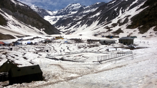 A view of snowfall at Sheshnag yatra camp on Wednesday.