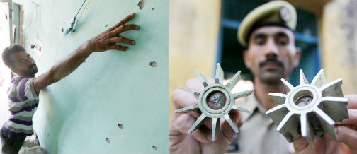 Homehome slider leftA villager show bullet marks in his house while a cop displays...