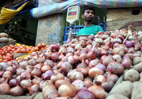A wholesale onion merchant looking for customers in Kanak Mandi, Jammu on Sunday. -Excelsior/Rakesh