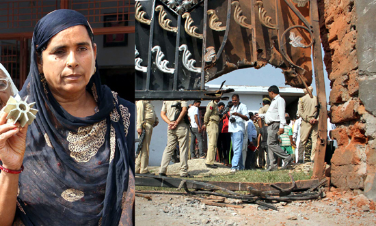 A woman shows shell fired by the Rangers (left) and a house damaged in Pakistan shelling in R S Pura sector. — Excelsior/Rakesh