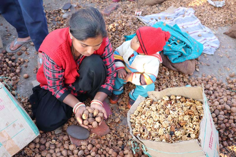 A worker cracks walnuts at a unit in Jammu. (UNI)