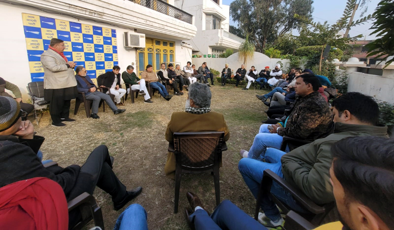 AAP organizational incharge for J&K Munish Kaushik addressing party leaders at a meeting in Jammu.