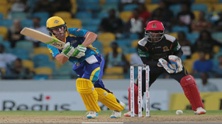 AB De Villiers picks up runs on the leg side as Devon Thomas (R) looks on during match of the Hero Caribbean Premier League match between Barbados Tridents and St Kitts & Nevis Patriots at Kensington Ovan in Bridgetown, Barbados.