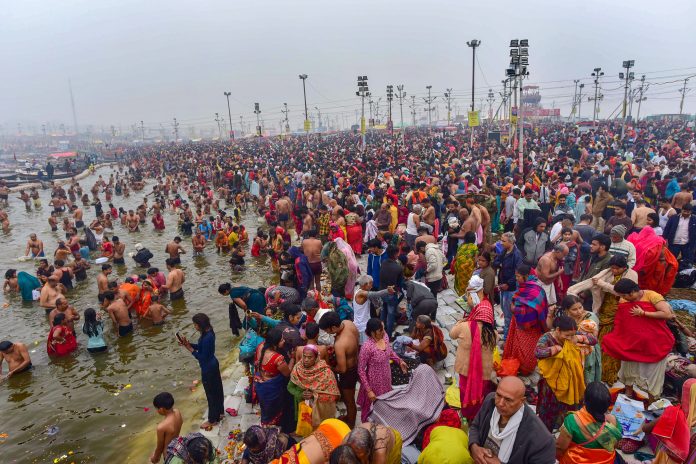 A Magh Mela administration official said that despite Tuesday’s rain and a cloudy sky and cold weather this morning, about 42.9 lakh people took the holy dip in the 12 ghats to mark Basant Panchami, the fourth bathing festival of Magh Mela in the Sangam city till 6 pm.