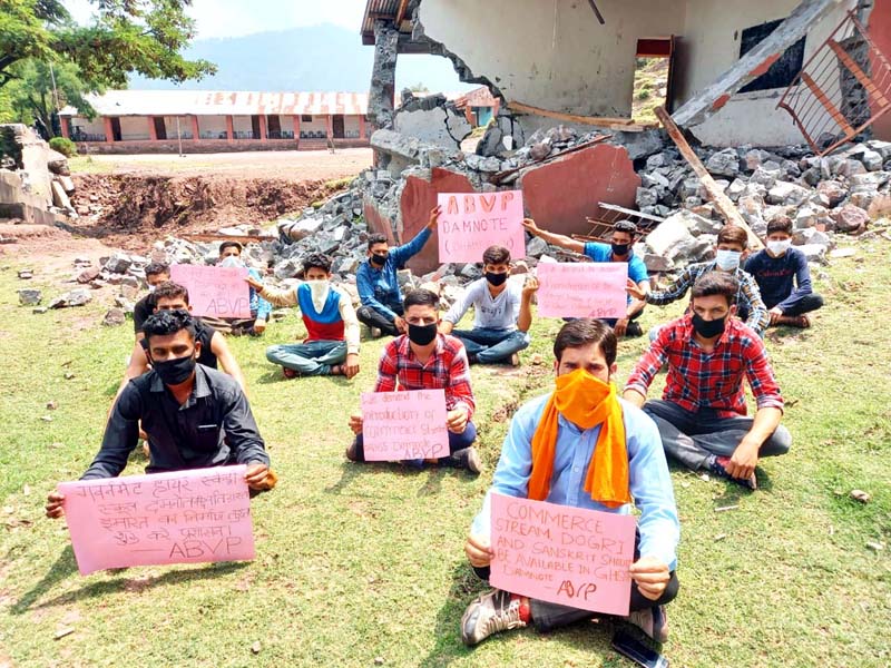 ABVP activists staging dharna for classroom in school building lying collapsed.ABVP activists staging dharna for classroom in school building lying collapsed.