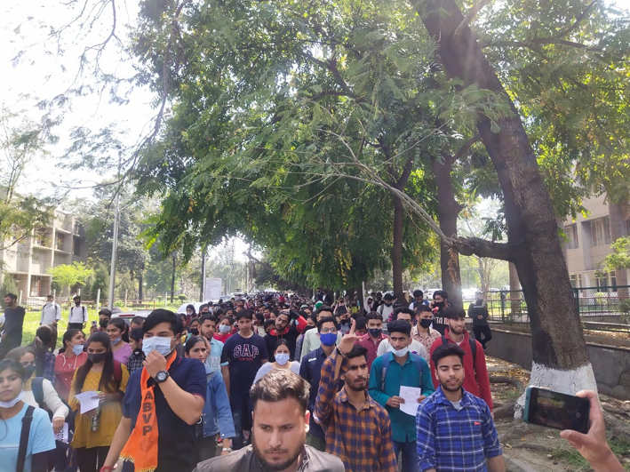 A large number of Jammu University students participated in the protest march on the campus.
