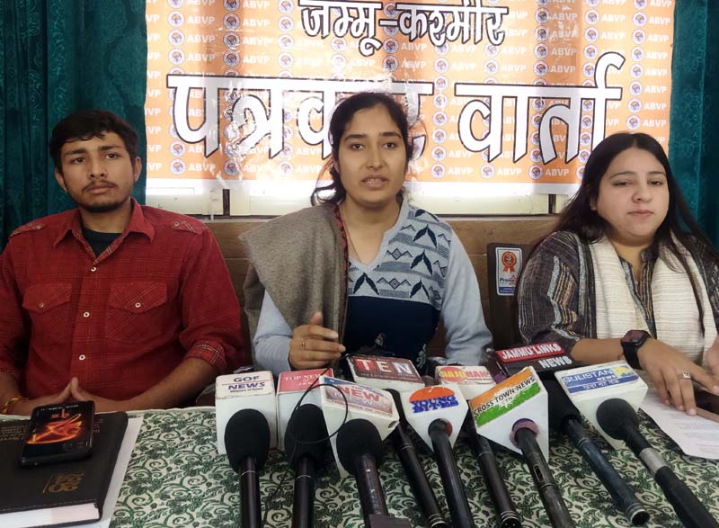 ABVP leaders addressing press conference at Jammu on Friday. -Excelsior/Rakesh